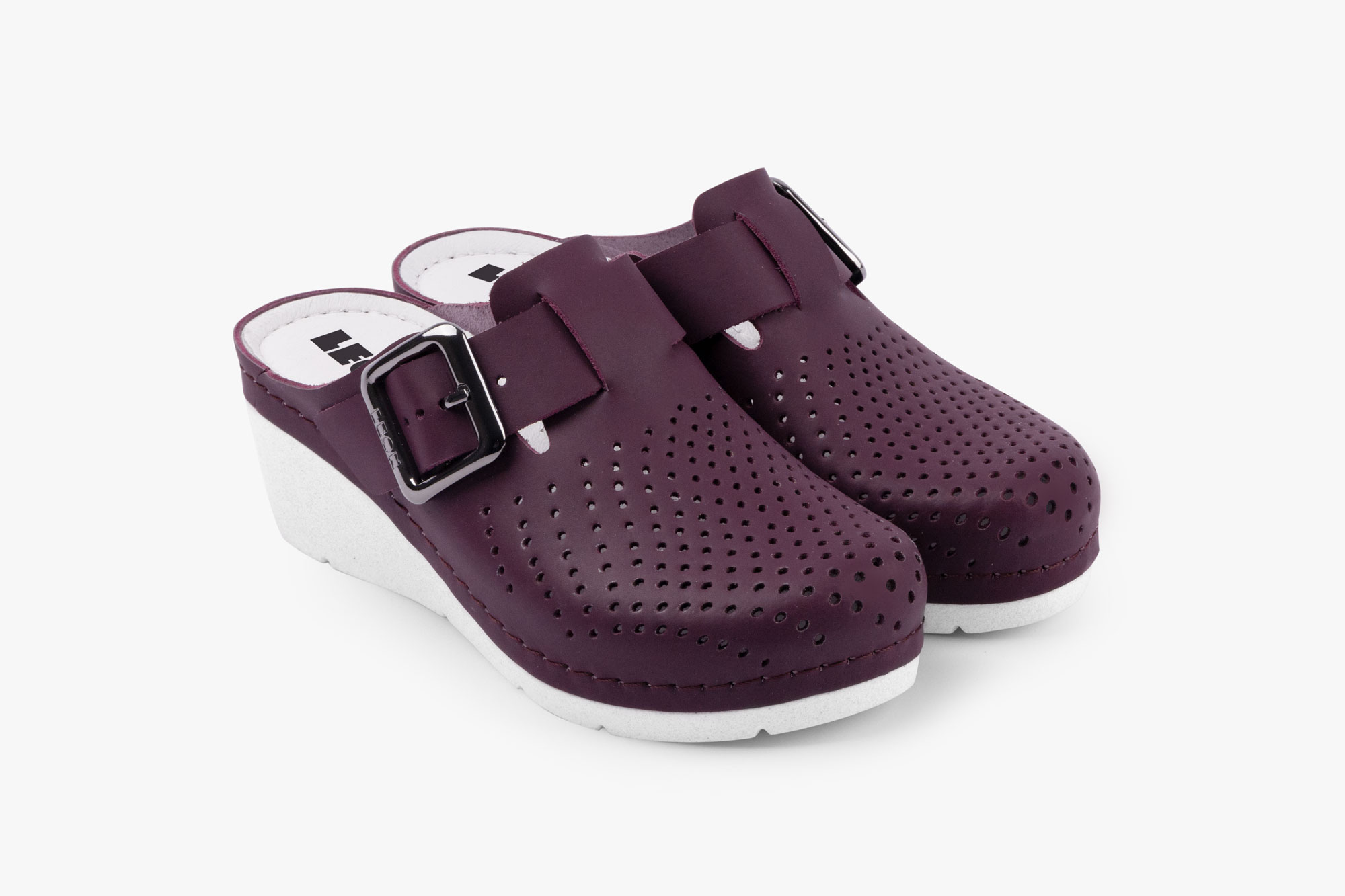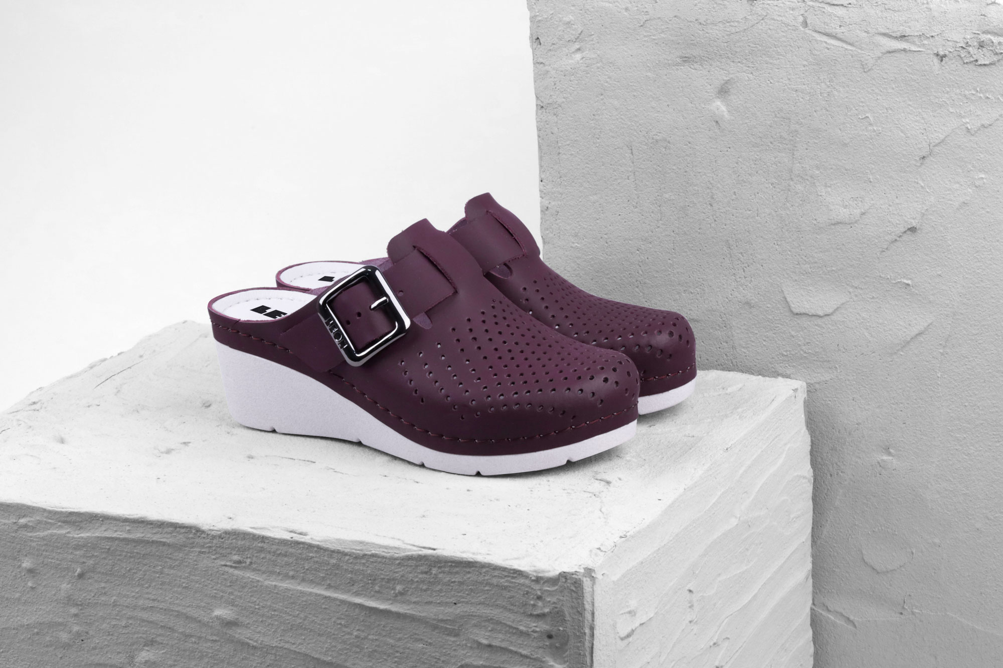 Ženska papuča izrađena od prirodne kože sa ventilirajućim rupicama i kožnom tabanicom koja sadrži masažni gel. Đon je naparvljen od poliuretanske mase