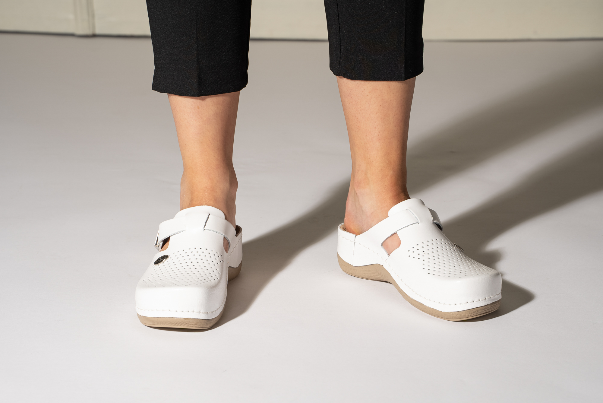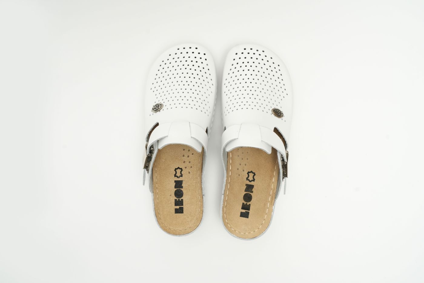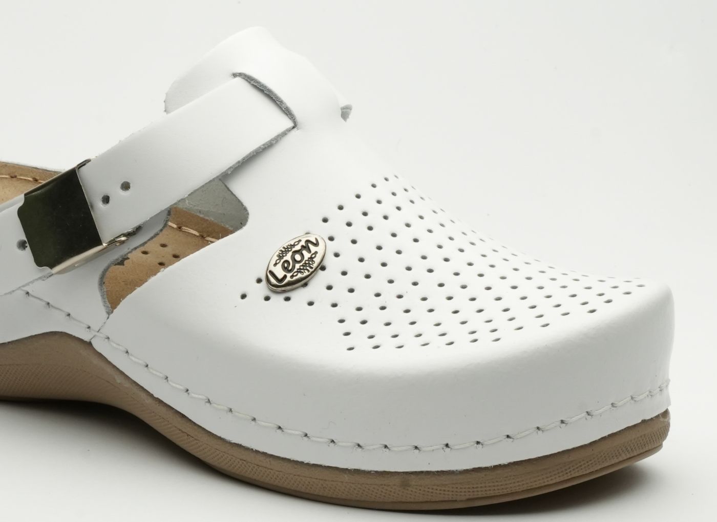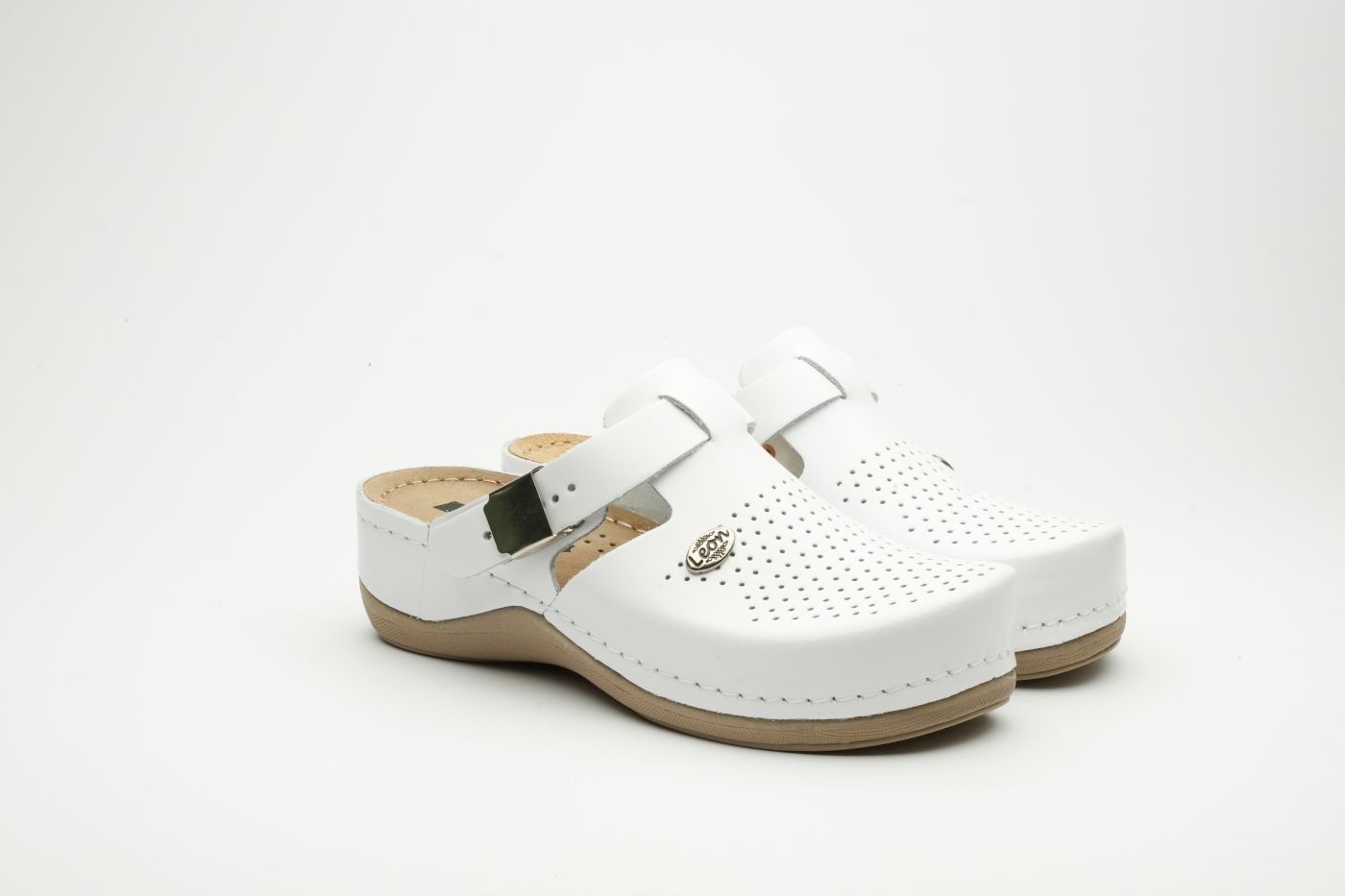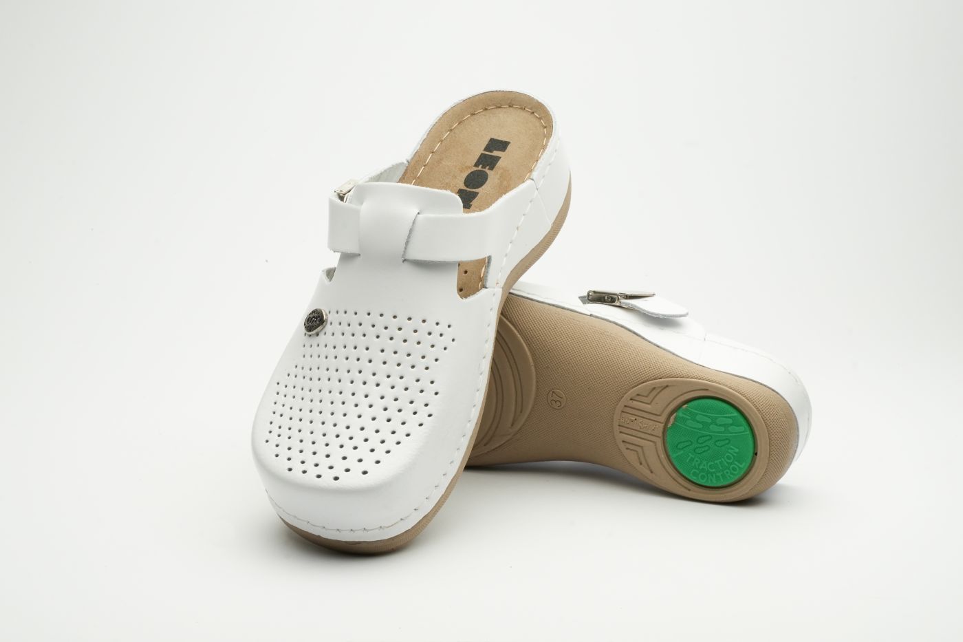 Ženska papuča izrađena od prirodne kože sa ventilirajućim rupicama i kožnom tabanicom koja sadrži masažni gel. Đon je naparvljen od poliuretanske mase koji sadrži anti – slip čep koji sprečava klizanje