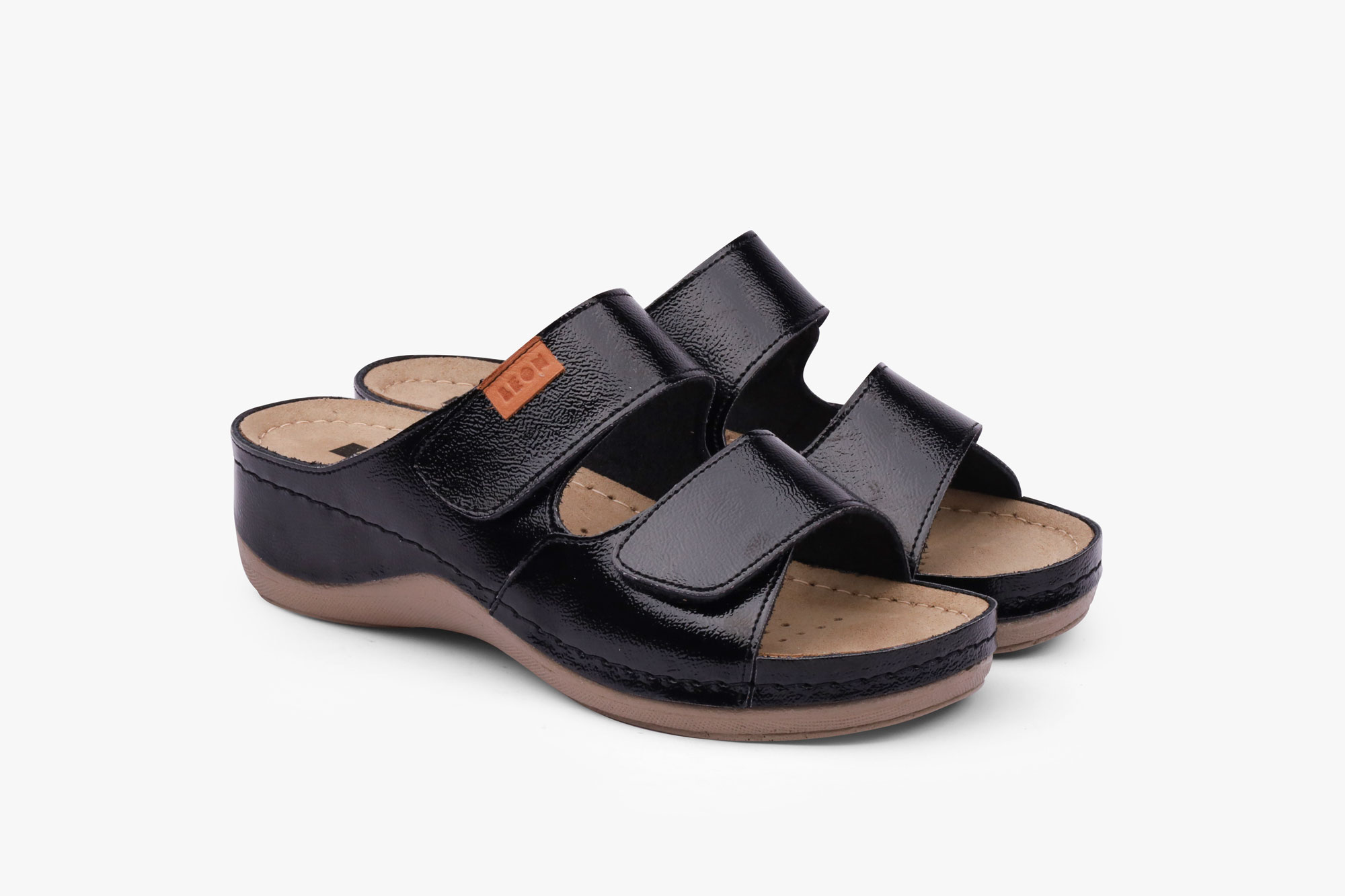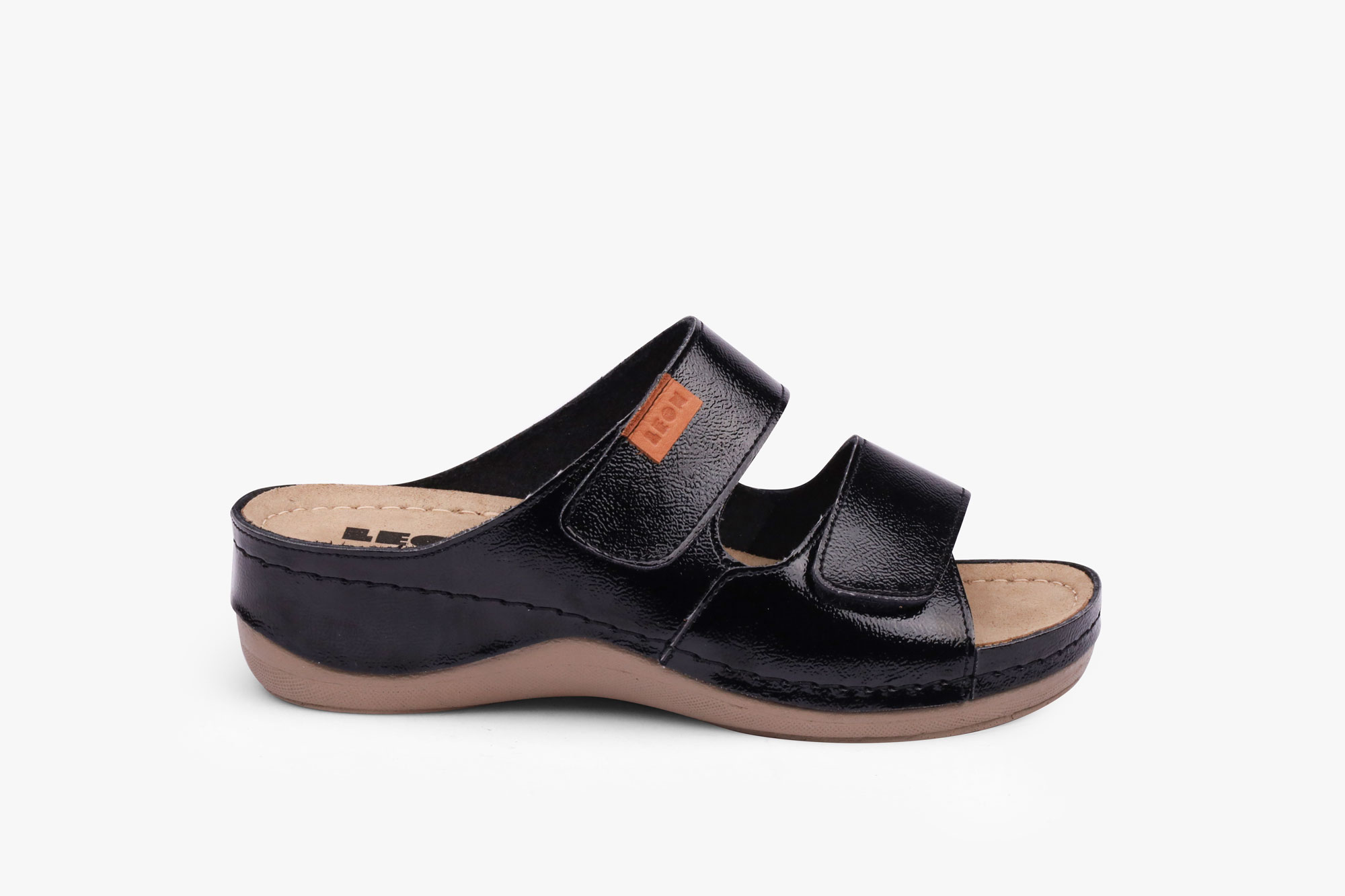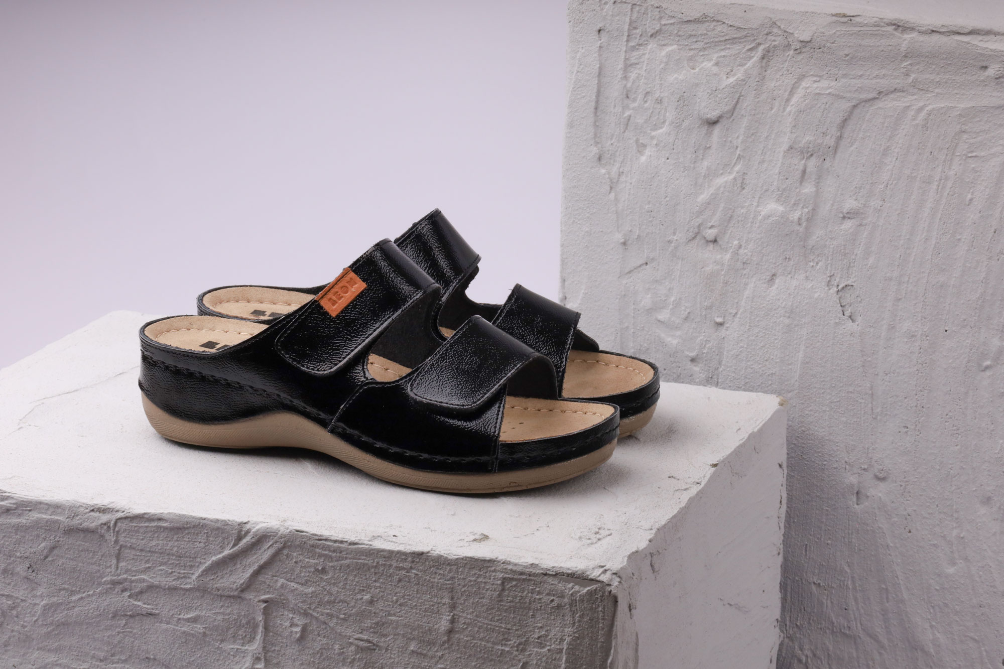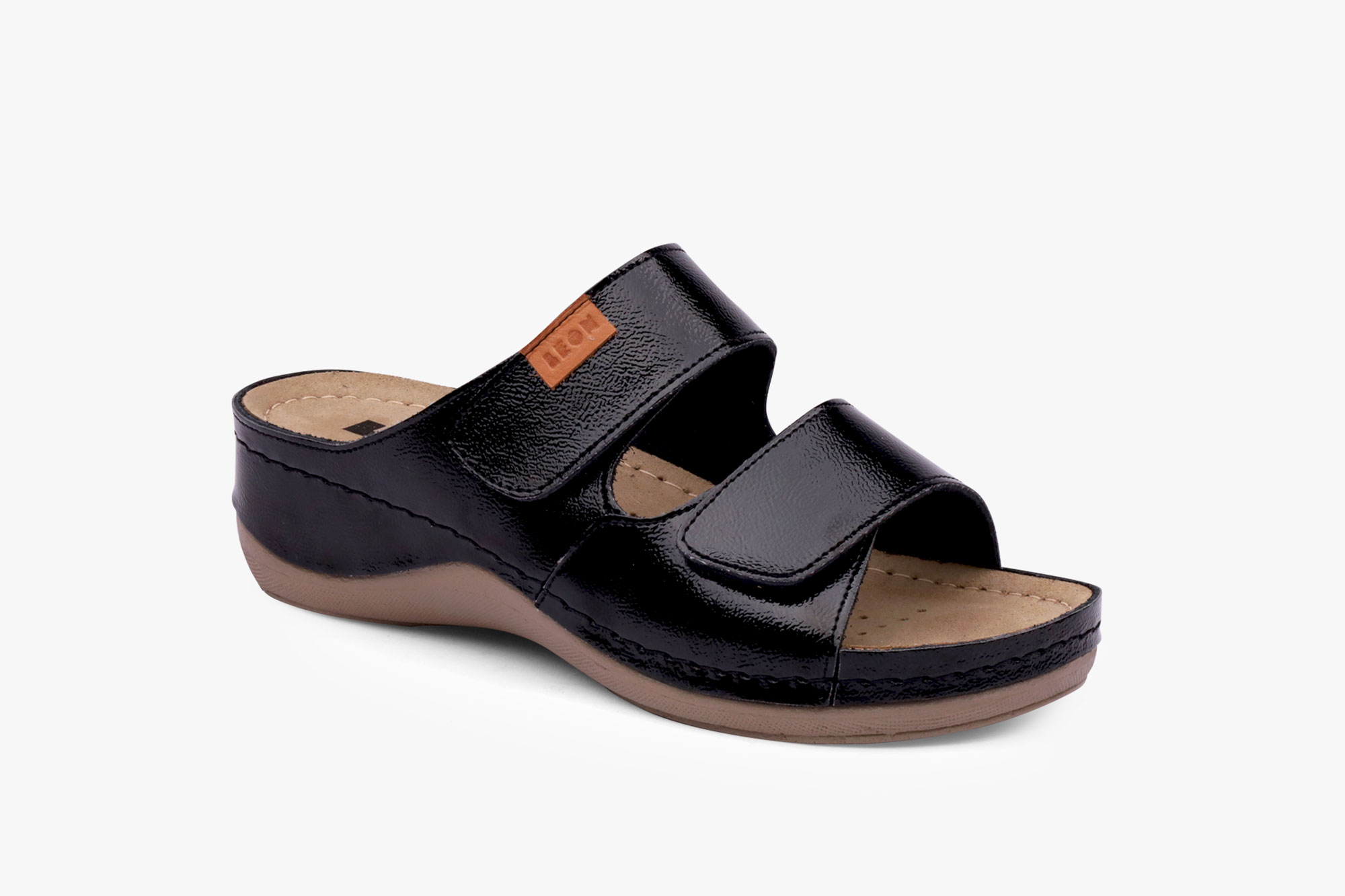 Ženska papuča izrađena od prirodne kože i kožnom tabanicom koja sadrži masažni gel. Đon je naparvljen od poliuretanske mase koji sadrži anti – slip čep koji sprečava klizanje. Gornjište sadrži čičak traku za podešavanje