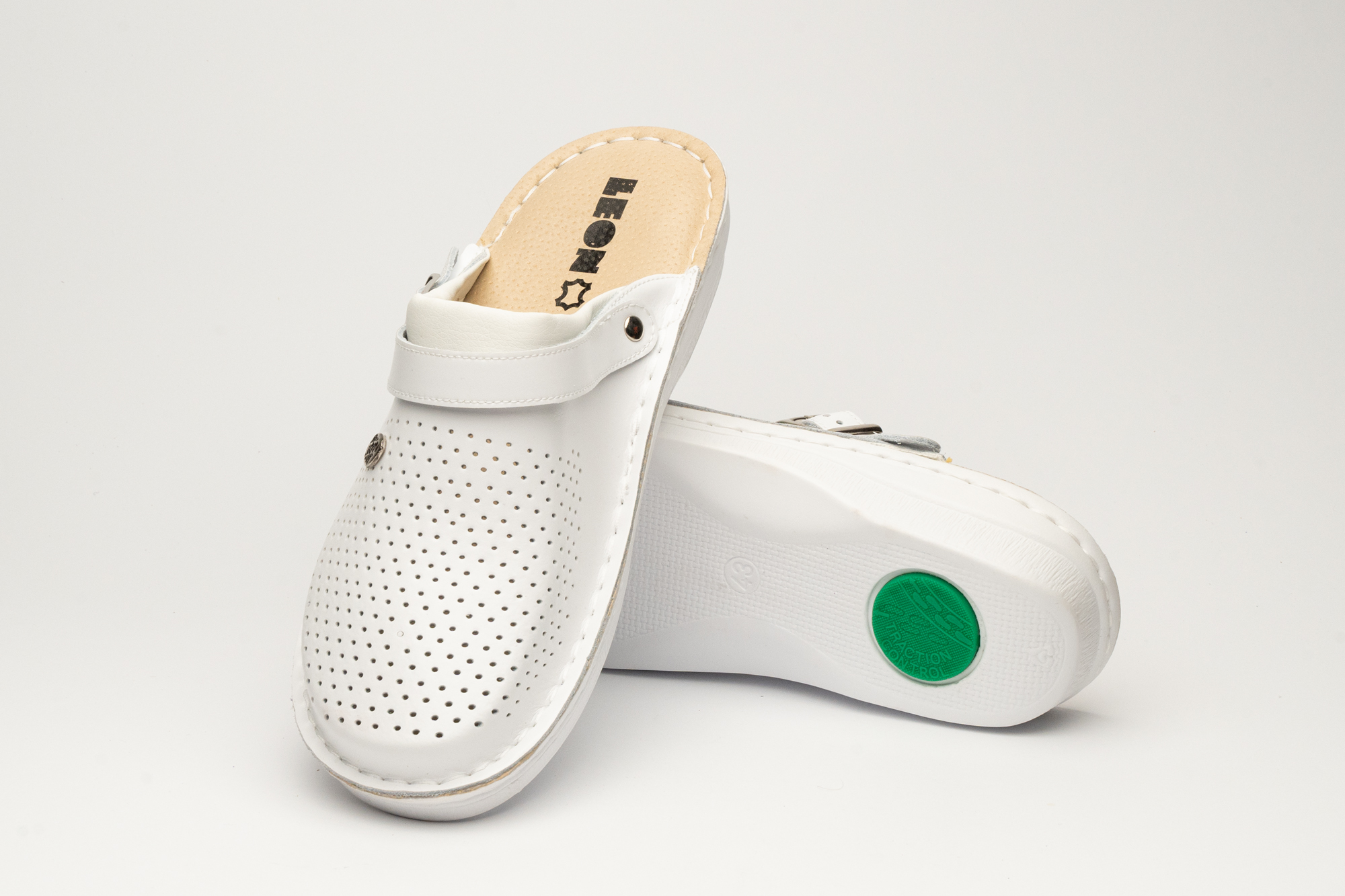 Muška papuča izrađena od prirodne kože sa ventilirajućim rupicama i kožnom protivznojnom tabanicom. Đon je naparvljen od poliuretanske mase koji sadrži anti – slip čep koji sprečava klizanje